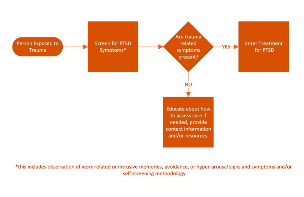Occupational Health professionals should be aware of and have access to validated screening tools for PTSD and other mental disorders. They should be trained in how to identify those at increased risk for PTSD, suicide and other mental disorders and refer to appropriate mental health professionals in a timely manner.